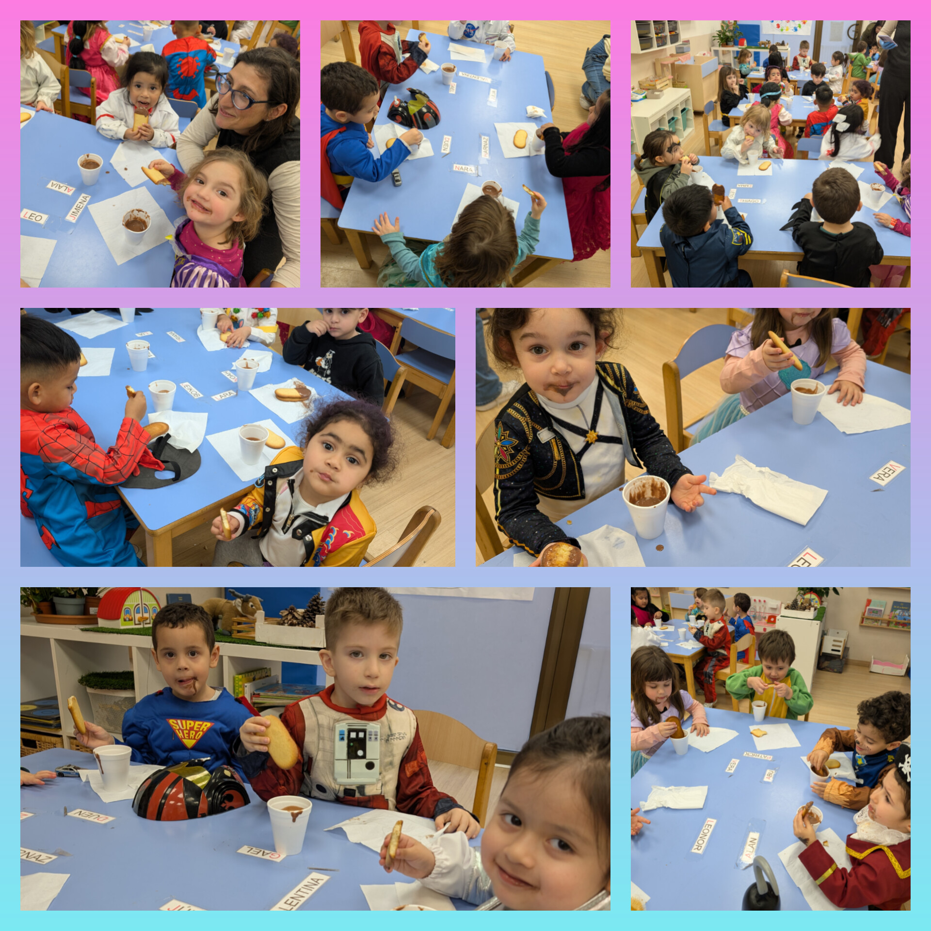 Després de dinar vam fer una xocolatada que ens va preparar l’AFA de l’escola. Van gaudir molt sucant melindros amb la xocolata i, fins i tot, van repetir! Vam acabar la festa ballant cançons de Carnaval.